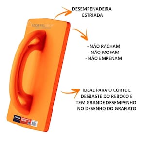 DESEMPENADEIRA POLIURETANO ESTRIADA 30X18CM 3 UNIDADESREF: AT161/1MARCA: ATLAS-DESCRIÇÃO DO PRODUTO:-Desempenadeira de Poliuretano, na cor laranja, com base estriada 300mmX180mm.-Produzida em poliuretano, é uma ferramenta de alta tecnologia que apresenta desempenho e vida útil superior aos modelos de madeira, PS ou plástico reforçado com fibra de vidro.-As desempenadeiras de PU da Atlas são termo fixas e não empenam, não mofam e não racham.-São surpreendentemente leves e produzidas em monobloco, o que evita que o cabo se desprenda da base.-INDICAÇÃO DE USO:-Ideal para o corte e desbaste do reboco e tem grande desempenho no desenho do grafiato.-Indicada para a uso em argamassas em geral.-DIMENSÕES:-Comprimento: 30cm-Largura: 18cm-Altura: 8,5cm-Vantagens em comprar conosco:- Temos todos os produtos em estoque a pronta entrega.- Enviamos em até 24 horas todos os pedidos confirmados.- Compra 100% segura.- Emitimos nota fiscal.- Produtos com qualidade superior.ATENÇÃO:Dúvidas pergunte a vontade que estamos sempre a sua disposição.-