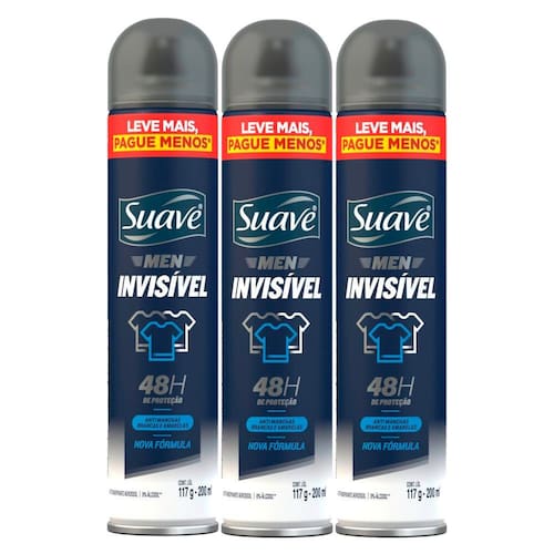 • O Desodorante Antitranspirante Suave Men Invisível garante 48 horas de proteção contra o suor e o mau odor • O antitranspirante masculino Suave Invisível previne a formação de manchas brancas e amarelas nas roupas • Desodorante masculino Suave Men possui nova fórmula com a tecnologia de micropartículas ativas, que te deixa seguro em qualquer situação • O desodorante spray possui toque seco e sua composição é 0% álcool** • Este desodorante contém uma fragrância masculina que deixa sua pele com um perfume prolongado • Este desodorante masculino é dermatologicamente testado