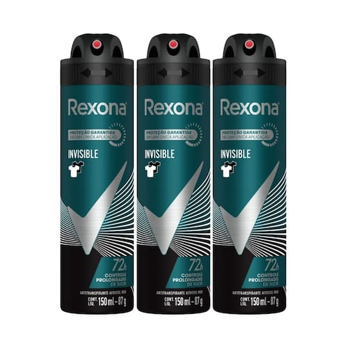 • O Desodorante Antitranspirante Aerosol Masculino Rexona Men Invisible possui nova fórmula: 72 horas de controle prolongado de suor • O novo desodorante masculino Rexona te mantém seco, fresco e protegido com uma única aplicação, deixando você pronto para encarar qualquer desafio • A tecnologia do Desodorante Antitranspirante Aerosol Masculino Rexona Invisible protege a roupa contra manchas brancas e amarelas • A fórmula do Antitranspirante Aerosol Masculino Rexona Invisible contém 0% de álcool etílico • Agite antes de usar. Aplicar o Desodorante Masculino Rexona Invisible somente nas axilas a não menos de 15 cm da pele • Este desodorante antitranspirante não afeta a camada de ozônio, possui lata em alumínio 100% reciclável e é feito com energia elétrica 100% renovável