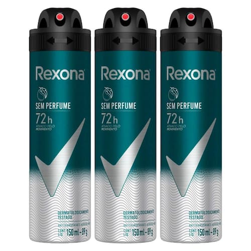 • A exclusiva fórmula do Desodorante Aerosol Masculino Rexona Sem Perfume garante 72 horas de proteção contra o suor e o mau odor ativado pelo movimento • O Desodorante Sem Perfume Rexona o mantém seco, refrescado e protegido para que nada o detenha • Antitranspirante masculino fácil de usar: agite e aplique nas axilas a não menos de 15 cm da pele • Esse desodorante antitranspirante contém fórmula hipoalergênica dermatologicamente testada que não compete com o seu perfume • Esse desodorante antitranspirante não contém álcool* e não afeta a camada de ozônio, sua lata é de alumínio 100% reciclável, feito com energia elétrica 100% renovável • O Desodorante Aerosol Masculino Rexona Sem Perfume permite que você fique sempre protegido, não importa o que aconteça. Rexona não te abandona