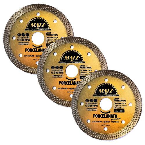 Kit 3 Disco Corte Turbo Para Porcelanato Premium 110X20Mm Matz Disco de corte turbo diamantado em X ideal para cortes secos em porcelanato, granito e mármore, projetado para precisão e velocidade. Suas estrias em X ajudam a dissipar o calor e reduzir o atrito, proporcionando cortes limpos e sem lascas em materiais delicados. Com alto desempenho e resistência, é perfeito para profissionais que buscam eficiência e acabamento impecável. Indicado para trabalhos em porcelanato e outros revestimentos cerâmicos.