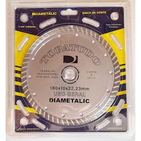 Informações técnicas: Perfil do corte: Diamantado Tipo de corte: A seco Diâmetro externo: 180mm 7.1/4'' Diâmetro do furo: 20mm Rotação máxima por minuto: 6600 Para corte de qualquer material Uso geral Proporciona qualidade e produtividade na operação Produto de altíssima qualidade com alta performance