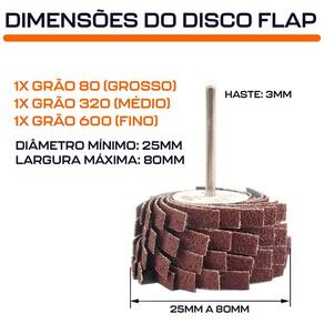 Kirt 3 Discos Flap de Lixa 25 a 80mm Grãos 80, 320 e 600 com Haste 3mm para Micro Retíficas Dremax - Marca: Dremax - Diâmetro externo mínimo: 25mm - Diâmetro externo máximo: 80mm - Gramatura: Grãos: 80, 320 e 600 - Tipo de grão abrasivo: Óxido de alumínio - Folha em óxido de alumínio de alta qualidade: durável, anti-ferrugem e anti-envelhecimento. - Indicado para lixar e polir superfícies irregulares de madeira, plástico, metal e materiais não metálicos. - Diâmetro da haste: 3mm 1/8mm - Haste em aço inox de alta qualidade, durável e prático - Indicado para todas as marcas de micro retíficas, como Dremel, Charbs, Einhell, Black+Decker, Dremax, Mondial, Vonder, Titanium, Western, Ingco, Gamma, Wesco, etc. - : 90 dias contra defeitos de fabricação Marca: Não Informado