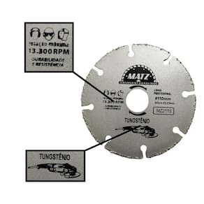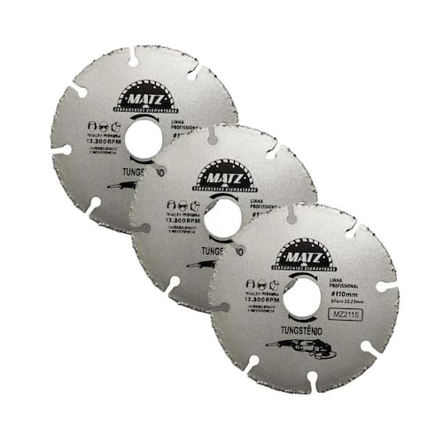 Disco de corte segmentado em tungstênio, ideal para cortes secos em madeira, MDF, compensado e acrílico. Seus segmentos de carboneto de tungstênio oferecem alta resistência ao desgaste, proporcionando cortes rápidos, precisos e com acabamento limpo. Compatível com esmerilhadeira, possui furo adaptável e acompanha anel de redução para uso em serra mármore Makita . Perfeito para marcenaria, construção e projetos que exigem precisão e durabilidade em materiais diversos.