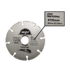 Informações técnicas: Perfil do corte: Segmentado Tipo de corte: A seco Dimensões: - Diâmetro externo: 110mm 4.3/8'' - Diâmetro do furo: 22,23mm 7/8'' - Acompanha anel de redução para 20mm - Espessura: 1,2mm Rotação máxima por minuto RPM : 13.300 - 80m/s Para corte de: Madeira, MDF, compensado e acrílico Proporciona qualidade e produtividade na operação Produto de altíssima qualidade com alta performance