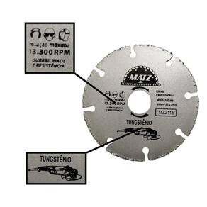 Informações técnicas: Perfil do corte: Segmentado Tipo de corte: A seco Dimensões: - Diâmetro externo: 110mm 4.3/8'' - Diâmetro do furo: 22,23mm 7/8'' - Acompanha anel de redução para 20mm - Espessura: 1,2mm Rotação máxima por minuto RPM : 13.300 - 80m/s Para corte de: Madeira, MDF, compensado e acrílico Proporciona qualidade e produtividade na operação Produto de altíssima qualidade com alta performance