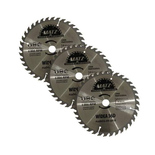Informações técnicas: Perfil do corte: Serra Tipo de corte: A seco e refrigerado Dimensões: - Diâmetro externo: 180mm 7.1/4'' - Diâmetro do furo: 20mm - Espessura: 2mm Quantidade de dentes: 36 Rotação máxima por minuto RPM : 8.000 - 80m/s Para corte de: Madeira em geral Proporciona qualidade e produtividade na operação Produto de altíssima qualidade com alta performance