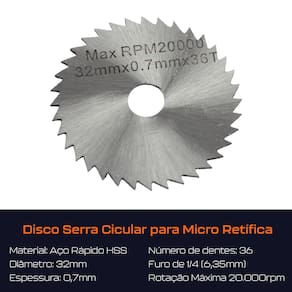 Kit 3 Discos Lâmina de Serra 32mm 36 Dentes para Micro Retíficas Dremax - Marca: Dremax - jogo exclusivo com 3 laminas de 32mm - Material: Aço Rápido HSS - Diâmetro: 32mm - Espessura: 0,7mm - Número de dentes: 36 - Diâmetro do furo: 1/4 6,35mm - Ideal para o corte de materiais duros como madeira, plásticos, laminados, alumínio, etc - Indicado para uso com micro retíficas de qualquer marca Dremel, Charbs, etc - Adequado para uso em Carpintaria e artesanato - Para sua segurança, aperte bem o parafuso da haste - Velocidade máxima de operação: 20.000 rpm - : 90 dias A DREMAX é a primeira e única marca brasileira dedicada exclusivamente às micro retíficas, acessórios e acoplamentos para esta indispensável ferramenta. Seja para trabalhos de precisão, artesanato, modelagem ou reparos, a DREMAX tem o produto certo para você. Marca: Não Informado