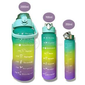 O destaque principal desse kit é a garrafa de 2 litros, que é o tamanho perfeito para te acompanhar ao longo do dia. Mas a surpresa não para por aí! Dentro dessa garrafa, você encontrará outra garrafa de 900ml, que também possui um visual incrível e frases motivacionais inspiradoras. E para completar o pacote, dentro da garrafa de 900ml, há uma garrafa menor de 350ml, proporcionando ainda mais praticidade e portabilidade.