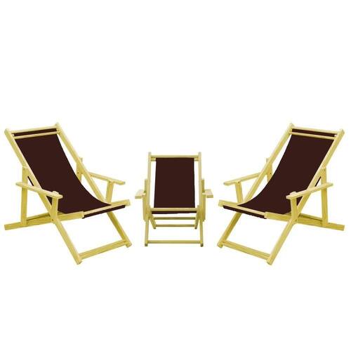 Kit 3 Espreguiçadeiras 2 Adulto E 1 Infantil-marrom 3 ESPREGUIÇADEIRAS C/B (2 ADULTO e 1 INFANTIL)Sabe aquele final de tarde que você tanto espera para tirar um descanso merecido? Ou aquela viagem para a praia programada a meses com a família? Pois é, nossas cadeiras espreguiçadeira serve exatamente para esses momentos, com várias opções de cores, os tecidos além de charmosos são hidro-repelentes e se adequam a qualquer ambiente, facilmente removíveis para higienização.Estrutura 100% de madeira maciça de ótima qualidade, a espreguiçadeira é totalmente dobrável e reclinável (4 posições de ângulo), com descanso para braço, sendo possível montar invertida sem o encosto de braço, perfeita para seu lazer em todos os ambientes, esse é o item que definitivamente não pode faltar na vida de quem de fato, quer aproveitar bons momentos! Medidas Cadeira Espreguiçadeira Adulto:Dimensões aproximadas do produto:Comprimento: 135 cm;Largura: 68 cm;Peso: 8,5 Kg4 Níveis de regulagem de alturaSuporta aproximadamente 120 kg.Fabricada Madeira Maciça Pinus Medidas Cadeira Espreguiçadeira Infantil:Dimensões aproximadas do produto:Altura 1: 74,5 cm;Altura 2: 64 cm;Altura 3: 51 cm;Profundidade: 66 cm.Dimensão aproximada total:Comprimento: 64 cm;Largura: 56 cm;03 Níveis de Regulagem de Altura;Tecido Reforçado;Fabricada em Madeira Maciça Pinus;Peso aproximado: 5,5 Kg;Suporta aproximadamente 70 kg;Cor da Madeira: ;Informações Adicionais:Garantia: 90 dias contra defeitos de fabricação.Acompanha 2 cadeiras adultas e 1 infantil Obs. A cor pode variar da foto conforme a tonalidade da madeira e iluminação.. !!