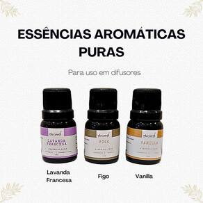 Kit 3 essências aromáticas puras 10ml cada aromá: 1 essência aromática pura lavanda francesa aromá 10ml tranquilidade 1 essência aromática pura figo aromá 10ml alegria 1 essência aromática pura vanilla aromá 10ml luxo 1 saquinho 100% algodão Essência aromática pura lavanda francesa aromá 10ml tranquilidade Essência pura aromática para uso em difusores elétricos ou cerâmicos. A fragrância lavanda francesa exclusiva da aromá transmite tranquilidade ao ambiente. Indicada principalmente para sala de estar e quartos, também pode ser Utilizado em ambiente de trabalho. Descrição olfativa lavanda francesa: Lavanda é originária da europa, age sobre o mesencéfalo estimulando-o através do nervo olfativo o que confere ação . Traz sensação de relaxamento e tranquilidade. Topo: lavanda e notas cítricas Corpo: rosa, alecrim, muguet e a suavidade do lavandin Fundo: âmbar e madeiras Embalagem plástica âmbar com gotejador 10ml Essência aromática pura figo aromá 10ml alegria Essência pura aromática para uso em difusores elétricos ou cerâmicos. A fragrância figo exclusiva da aromá transmite alegria. Indicada principalmente para sala de estar e quartos, também pode ser Utilizado em ambiente de trabalho. Descrição olfativa figo: Figo é uma fruta delicada, doce e muito aromática. Sua fragrância é contagiante e transfere alegria ao ambiente Topo: notas lactônicas, madresilva, coco e a delicada peônia. Corpo: notas quentes de chocolate, baunilha, figo e o aconchego do powdery Fundo: elegância do âmbar, vetiver e cedro Embalagem plástica âmbar com gotejador 10ml Essência aromática pura vanilla aromá 10ml luxo Essência pura aromática para uso em difusores elétricos ou cerâmicos. A fragrância vanilla exclusiva da aromá transmite luxo indicada principalmente para sala de estar e quartos, também pode ser Utilizado em ambiente de trabalho. Descrição olfativa vanilla: Notas de topo: limão, alecrim e bergamota Notas de corpo: baunilha e cedro Notas de fundo: patchouli e musk Embalagem plástica âmbar com gotejador 10ml Modo de uso: Uso em difusores / umidificadores elétricos: cerca de 10 gotas após preencher com água o difusor. Uso em difusores elétricos cerâmicos: complete até cerca da metade do difusor com a essência, ligue na tomada e ligue o botão. Marca: Não Informado