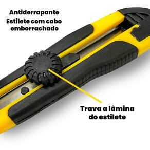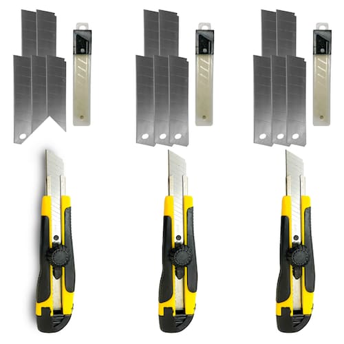 Kit com 3 Estiletes para uso geral com cabo emborrachado antiderrapante + Laminas de reposição super afiadas. Indicado para cortes precisos em papéis, plásticos, filmes, cartonagem, trabalho escolares e muito mais.. Cada Estilete acompanha box com 5 laminas afiadas de 18mm. Composição do kit. 3 Estiletes com cabo emborrachado. 3 Box com 5 Laminas de 18mm Super afiadas para reposição Marca: ADB