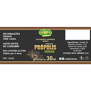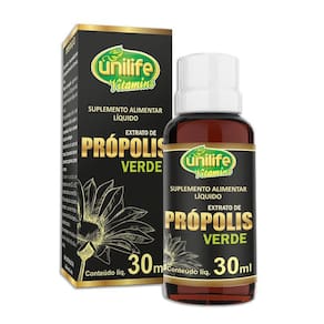 Kit 3 Extrato de Própolis Verde Unilife 30ml Sobre o produto EXTRATO PRÓPOLIS VERDE Unilife Vitamins Desenvolvido a partir de extrato de própolis verde em pó, o produto é livre de glúten Modo de usar 1 gota ao dia. Ingredientes Extrato de própolis 20%, ácido ascórbico, bisglicinato de zinco, selenometionina, antiumectantes: silicato de magnésio, estearato de magnésio e dióxido de silício. Marca: Não Informado Ean: 7908609505502