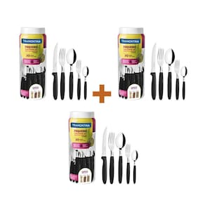 Componentes do kit: - 3 faqueiros inox de 30 peças ipanema preto - tramontina Faqueiro facas talheres ipanema 30pç tramontina 23398/088 Faca e garfo. Descrição ficha técnica: Modelo ipanema 30 peças. Cód. 23398/088 cor preta. Uso seguro e adequado: - antes da primeira utilização, lave bem as peças e seque-as. - produtos cortantes e perfurantes, tenha cuidado e mantenha sempre fora de alcance das crianças. - para maior durabilidade dos produtos, recomenda-se secar bem antes de guardar, mesmo após lavagem em máquinas. - para descarte dos produtos e embalagem, siga a orientação de reciclagem vigente. Conteúdo de cada conjunto: 6 facas lâmina 11,2cm - medida 21cm 6 garfos de mesa. - medida 19cm 6 colheres de mesa. - medida 19cm 6 garfos para sobremesa. - medida 14cm 6 colheres para chá. - medida 14cm - lâmina em aço inox, maior resistência a desgaste por fricção, raspagem. - fácil manuseio e limpeza sempre cuidando com navalha e pontas . - 30 pç por embalagem. Peso líquido: 0,95 kg Peso bruto: 1,05 kg Especificação da embalagem do kit: Peso bruto: 3,15 kg Medida embalagem: 27 cm alt x 31 cm l x 9 cm p. Perguntas frequentes: - Sim, , lacrado e de fábrica. - tem - qual a é de 12 meses contra defeito de fabricação. Ean: 7890100025859