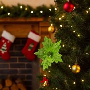 O acabamento com glitter e lantejoulas verdes proporciona um efeito luminoso e festivo, perfeito para composições natalinas de destaque. O modelo possui haste tipo pick, que facilita a fixação nos mais diversos elementos da decoração.