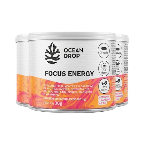 Kit 3 Focus Energy Ocean Drop Vegano 60 Cápsulas O Focus Energy foi desenvolvido para melhorar o desempenho físico e mental, repor importantes vitaminas e nutrientes, e reduzir o e cansaço. Ele contribui para a concentração, disposição, bem-estar e energia, tanto física quanto mental. Modo de consumo: - Sugere-se a ingestão de 2 cápsulas ao dia. Produto com duração de 1 mês. Composição: - Bitartarato de colina - Bisglicinato de magnésio - Cafeína - Coenzima Q10 - Cloridrato de piridoxina vitamina B6 - D-biotina - Cianocobalamina vitamina B12 - Estabilizante celulose microcristalina - Antiumectante dióxido de silício - Cápsula vegetal: Hidroxipropilmetilcelulose, carragenina e acetato de potássio - NÃO CONTÉM GLÚTEN. Indicação: - Cognição - Memória - Performance mental Contraindicação: - Este produto é indicado para o grupo populacional acima de 19 anos. - Não deve ser consumido por gestantes, lactantes e crianças. - Este produto não é um . - Também não é indicado para alérgicos ou sensíveis à cafeína, hipertensos, cardíacos, com úlceras ou hiperacidez estomacal. Marca: Não Informado