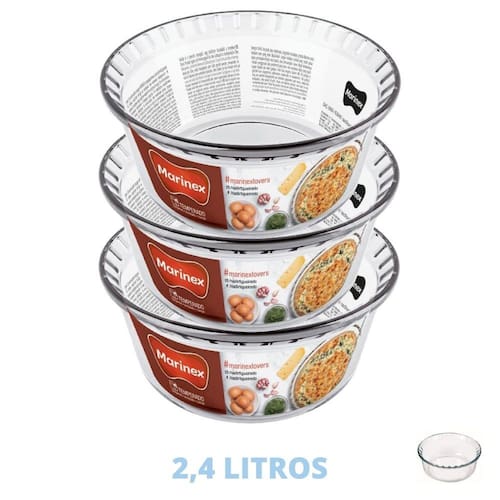 Itens inclusos: 3 Assadeiras de vidro Suflê 2,4 LitrosMarinex com as respectivas descrições acima