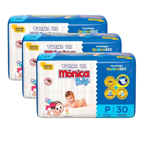 Fralda Infantil Turma da Mônica Baby Mega Tamanho P A Turma da Mônica Baby uniu proteção e conforto em uma nova opção de fralda, para garantir que seu bebê cresça feliz e tenha as melhores lembranças da sua infância. A Nova fralda Turma da Mônica Baby possui a nova Tecnologia QuatroSec para que ele fique calmo, tranquilo e seguro durante o dia e a noite toda. Conta com um exclusivo sistema de canais que distribui mais rápido o xixi, barreiras anti-vazamento e uma fina camada extra que ajuda a manter o bebê sequinho por até 12 horas, além de cintura elástica que proporciona um perfeito ajuste no corpinho. A Nova fralda Turma da Mônica Baby possui a nova Tecnologia QuatroSec; com um exclusivo sistema de canais que distribui mais rápido o xixi, barreiras anti-vazamento e uma fina camada extra que ajuda a manter o bebê sequinho por até 12 horas, além de cintura elástica que proporciona um perfeito ajuste no corpinho. A Turma da Mônica Baby é uma marca de excelência no mercado de fraldas infantis há mais de 25 anos. A marca e sua turma estão presentes no coração dos brasileiros há mais de 3 gerações, e agora também faz parte do portfólio da Ontex. Os novos produtos foram pensados e elaborados para as mamães e os papais que, assim como nós, valorizam a tradição e os valores culturais aprendidos na infância, alinhado com o conforto e a qualidade dos produtos Turma da Mônica para seu bebê. Modo de uso: 1. Coloque o bebê sobre a fralda aberta com as fitas na parte traseira. 2. Abra as fitas agarradinhas e ajuste a fralda no corpinho do bebê posicionando as fitas sobre a faixa frontal branca. Ean: 7896012879764