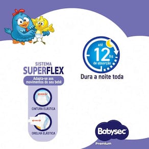 A fralda infantil Babysec Premium Galinha Pintadinha Até 12h de Proteção possui sistema Flexiprotect com orelha e cintura elástica, garantindo o melhor ajuste, conforto e proteção para o bebê. Desenvolvida com tecnologia de gel extra absorvente e barreiras impermeáveis, garantindo rápida absorção e mantendo a pele do bebê seca e segura por mais tempo. Tem cobertura com toque suave e decorada com vários desenhos divertidos.