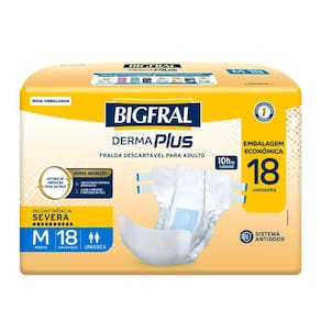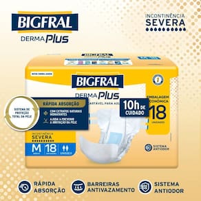 A Bigfral DermaPlus foi desenvolvida para adultos com incontinência urinária severa. Possui o exclusivo sistema de proteção total da pele, com extratos naturais hidratantes que ajudam a prevenir irritações, mantendo a pele protegida e saudável, além de sistema antiodor, trazendo até 10h de proteção e cuidado.