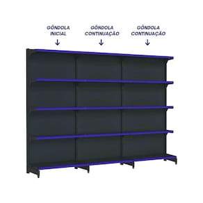 Nosso kit com 3 gôndolas de parede na cor preta é ideal para armazenamento e exposição de produtos em supermercados, mercearias, farmácias, lojas de utilidades, materiais de construção, agropecuárias, e muito mais, variando de acordo com a capacidade de peso de cada modelo.com 2,02m de altura, esta gôndola proporciona uma exibição eficiente dos produtos, maximizando o espaço vertical da sua loja e permitindo uma organização prática e acessível.as gôndolas possuem uma capacidade de 40kg por bandeja. com pintura eletrostática epóxi, antibacteriana, uniforme e resistente.possui bandejas com inclinação em 3 posições e bandejas reguláveis na coluna a cada 25mm, o que permite adição de bandejas extras. a bandeja é construida em chapa 26 (espessura de 0,50mm). fundo da bandeja quadrado para melhor exposição.pés com regulagem de altura, colunas dupladas e tratamento especial da superfície.a gôndola é prática e fácil de montar, com sistema de encaixe sem utilização de parafusos. você pode instalar suas gôndolas rapidamente, sem complicações, permitindo que você comece a exibir seus produtos em pouco tempo.todas as nossas gôndolas possuem qualidade, resistência e durabilidade garantidas pelo uso de matérias-primas de alto padrão, processos produtivos com a mais atual tecnologia e um cuidado especial em cada etapa.modernas e elegantes, nossas gôndolas são projetadas para destacar seus produtos e criar um ambiente agradável de compras para seus clientes, incentivando a exploração e aumentando as vendas.aproveite ao máximo cada centímetro disponível em sua loja com nossas gôndolas projetadas para maximizar o espaço de exposição, permitindo uma ampla variedade de produtos em um layout eficiente.- capacidade de 40kg por bandeja;- colunas dupladas: com sistema de encaixe, sem utilização de parafusos;- tecnologia exclusiva de apoio sgl;- pés reforçados e com regulagem;- bandejas inclináveis: oferece 3 opções para melhor exposição;- bandejas reguláveis a cada 25mm: possibilidade de adicionar bandejas extras;- reforço na base e bandeja: para maior capacidade de carga e estabilidade;- bandeja é construida em chapa 26;- ponteira da coluna: maior proteção e durabilidade.*porta etiquetas: vendidos separadamente, em variadas opções de cores.> o kit contém- 01x gôndola new premium 2,02m preta parede inicial- 02x gôndola new premium 2,02m preta parede continuação> especificaçõesgôndola parede inicialmodelo: gôndola de centro iniciallinha: fit 40altura: 2,02mcor: pretaquantidade de bandeja: 5peso suportado por bandeja: 40kgchapa: 26gôndola parede continuaçãomodelo: gôndola de parede continuaçãolinha: fit 40altura: 2,02mcor: pretaquantidade de bandeja: 5peso suportado por bandeja: 40kgchapa: 26> medidas do produtogôndola parede inicialaltura: 2,02mlargura: 0,96mpeso: 26kglargura da bandeja: 0,90mprofundidade da bandeja base: 0,40mprofundidade das bandejas superiores: 0,30mgôndola parede continuaçãoaltura: 2,02mlargura: 0,93mpeso: 20kglargura da bandeja: 0,90mprofundidade da bandeja base: 0,40mprofundidade das bandejas superiores: 0,30m> garantia- 6 meses> troca e devoluçãomediante termos da política de trocas e devoluções da empresa.