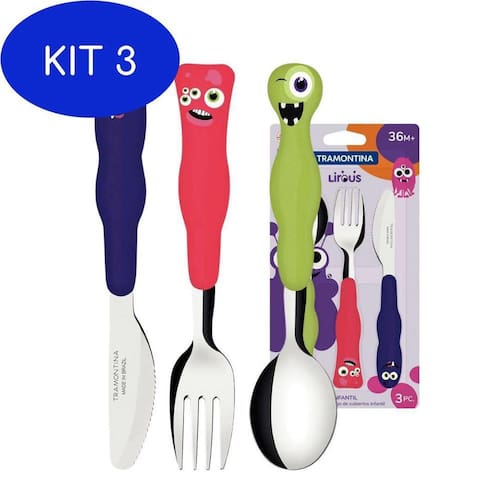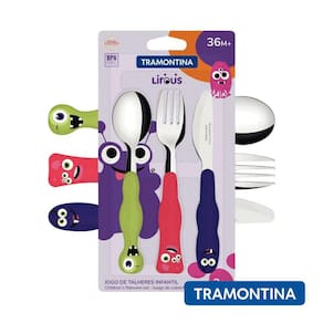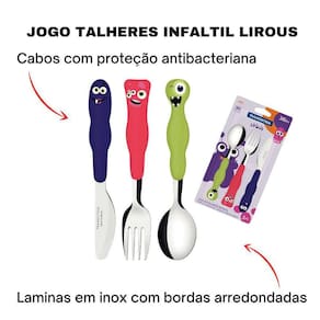 Jogo De Talheres Infantil Tramontina Colorido 3 pcs Inox Lirous Monstrinhos Cor: Verde Descrição: Com o jogo de talheres infantil Tramontina Lirous colorido 03 peças vai agregar muito maior autonomia e diversão para a refeição das crianças. Produzidos com lâminas em aço inox e cabos de polipropileno, os talheres são resistentes e permitem que as crianças os manuseiem sem perigo. Eles ainda contam com proteção AMTIBACTERIANA que inibe o crescimento de fungos e bactérias por toda a vida útil do produto. Eles ainda podem ser lavados na maquina de lavar louças, deixando a sua rotina muito mais pratica. Conteudo embalagem : 1 - faca lirous 237880931 - garfo lirous 237890701 - colher lirous 23790020CONTEÚDO DA EMBALAGEM: 3 Jogo De Talheres Infantil Tramontina Colorido 3 Pcs Inox Lirous Monstrinhos