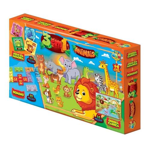 3 Jogos em 1 Animais Quebra Cabeça, Jogo Da Memória e Dominó -