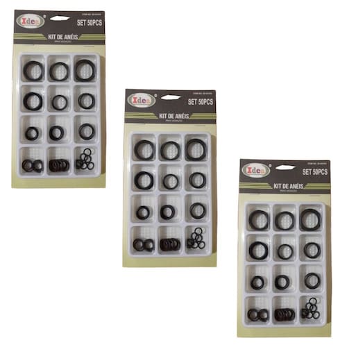 3 Kits de Anéis para Vedação contendo 50 peças cada embalagem de diversos tamanhos. São 12 tamanhos de anéis conforme relacionado abaixo: