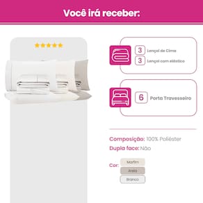 Lençol de Cima: 2,50 x 2,75m Lençol de Baixo com Elástico: Ideal para colchões de 2,00m x 1,90m com até 40cm de altura Fronhas: 2 unidades de 70cm x 50cm