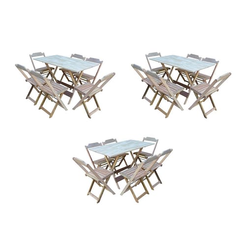 Kit 3 Jogos De Mesa Dobravel Com 6 Cadeiras De Madeira 120x70 Para Restaurante E Bar - Sem Pintura O produto é ideal para bares, restaurantes, estabelecimentos, áreas de lazer e também para sua casa. Feito em madeira maciça, tornando resistentes e duráveis. Seu design permite que seja encaixado em qualquer ambiente, trazendo um toque a mais para seu estabelecimento. Além de sua durabilidade, o que lhe trará conforto para servir seus clientes. Por ser dobrável torna-se mais fácil guardar, manusear e limpar o produto.