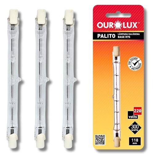 Potência: 300w Tensão: 220v Modelo: j118 palito Marca: ourolux Soquete: r7s Cor da luz: branca quente Uso: refletores, luminárias, iluminação externa Acendimento instantâneo Alta eficiência luminosa Produto com ótimo custo-benefício