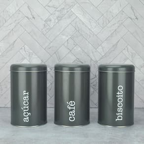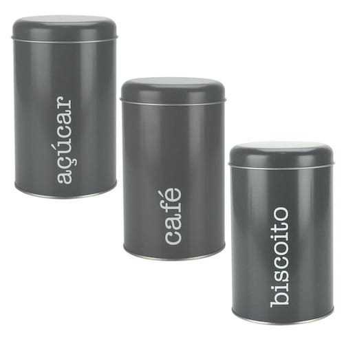Kit 3 Latas Metal Porta Mantimentos Biscoito, Café e Açúcar Com o Kit 3 Latas Metal Porta Mantimentos, você pode armazenar seus biscoitos, café e açúcar com estilo e praticidade. As latas são feitas de metal durável e possuem design moderno, além de manterem os alimentos frescos por mais tempo. Adquira já o seu e organize sua cozinha com elegância