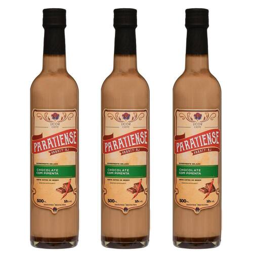 Kit 3 Licores de Chocolate com Pimenta Paratiense 500 ml Saboroso licor de Chocolate com Pimenta Paratiense. Combinação perfeita da doçura do chocolate com a picância da pimenta, tornando esse licor sexy. Graduação Alcóolica: 12% Ingredientes: açúcar cristal, água potável, leite em pó, álcool etílico potável de cereais, chocolate meio amargo, essência de pimenta dedo de moça, aditivo conservador INS 211 e INS 202 Validade: Valido até 12 meses após a data de fabricação, desde que conservado ao abrigo de sol e de calor. Não contém glúten Marca: Paratiense