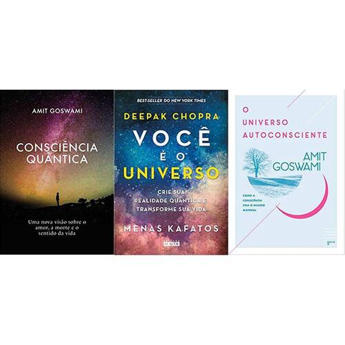 KIT 3 LIVROS Consciência Quântica + Você é o universo + O universo autoconsciente Consciência quântica: Uma nova visão sobre o amor, a morte e o sentido da vida Capa comum - 26 maio 2021Edição Português por Amit Goswami Autor Desde a Antiguidade, temas como a existência de Deus, a morte e o sentido da vida são explorados por diversas religiões e, mais recentemente, desprezados pelo materialismo científico. No entanto, essas duas visões de mundo mostraram-se incapazes de dar uma resposta satisfatória aos fenômenos da nossa existência. Enquanto as tradições religiosas submetem o mundo material a regras supostamente transmitidas por Deus, a ciência materialista suprime a espiritualidade e descarta tudo que não pode ser explicado pela lógica newtoniana.Detalhes do produtoEditora : Editora Aleph; 2 edição 26 maio 2021 Idioma : PortuguêsCapa comum : 248 páginasISBN-10 : 6586064767ISBN-13 : 978-6586064766Dimensões : 22.8 x 15.6 x 1.6 cmAno de publicação: 2021Autor: Amit GoswamiVocê é o universo: Crie sua realidade quântica e transforme sua vida Capa comum - 1 março 2017Edição Português por Deepak Chopra Autor , Menos Kafatos Autor , Maria Sylvia Corrêa Tradutor , Vera Caputo Tradutor Realidade em que você vive será sua para abraçá-la ou transformá-la. O que acontece quando a ciência moderna desafia tudo o que conhecemos sobre realidade Neste trabalho brilhante e atual, o best-seller Deepak Chopra e o reconhecido físico Menas Kafatos propõem uma nova aliança entre ciência e espiritualidade, entre física quântica e vida cotidiana, questionando nosso papel na construção da realidade em que vivemos. Trazem assim uma nova e inovadora compreensão de quem somos e de como podemos transformar o mundo enquanto atingimos nosso maior potencial.Detalhes do produtoEditora : Editora Alaúde; 1 edição 1 março 2017 Idioma : PortuguêsCapa comum : 288 páginasISBN-10 : 8578814215ISBN-13 : 978-8578814212Dimensões : 22.61 x 15.49 x 1.78 cmAno de publicação: 2017Autor: Deepak ChopraO universo autoconsciente: Como a consciência cria o mundo material Capa comum - 27 março 2007Edição Português por Amit Goswami Autor , Ruy Jungmann Tradutor Lançado originalmente em 1993, este livro abalou a comunidade ao apresentar uma teoria revolucionária. A partir dos princípios da física quântica, o autor demonstra que é a consciência, e não a matéria, a base de tudo que existe, resgatando a herança filosófica das grandes tradições religiosas e unindo mente e corpo num novo paradigma científico.Detalhes do produtoEditora : Editora Aleph; 3 edição 27 março 2007 Idioma : PortuguêsCapa comum : 368 páginasISBN-10 : 857657280XISBN-13 : 978-8576572800Dimensões : 22.8 x 16 x 2.2 cmAno de publicação: 2007Autor: Amit GoswamiCondição do item: NovoTipo de capa: ComumTipo de narração: ManualFormato: Papel