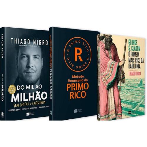 Kit 3 livros do mil ao milhão + primo rico + o homem mais rico da babilonia Kit 3 livros do mil ao milhão + primo rico + o homem mais rico da babilonia Do mil ao milhão. Sem cortar o cafezinho. Capa comum - edição padrão, 10 novembro 2018Edição português por thiago nigro autor Editora : harpercollins; 1 edição 10 novembro 2018 Idioma: portuguêsCondição do item: novoTipo de narração: manualTipo de capa: comumFormato: PapelCapa comum : 192 páginasIsbn-10 : 8595083274Isbn-13 : 978-8595083271Dimensões : 23 x 15.2 x 1 cm Em seu primeiro livro, thiago nigro, criador da plataforma o primo rico, ensina aos leitores os três pilares para atingir a independência financeira: gastar bem, investir melhor e ganhar mais. Por meio de dados e de sua própria experiência como investidor e assessor, nigro mostra que a riqueza é possível para todos - basta estar disposto a aprender e se dedicar. Método financeiro do primo rico capa dura - 30 novembro 2020Edição português Por thiago nigro autor Editora : harpercollins; 1 edição 30 novembro 2020 Idioma : portuguêsCapa dura : 208 páginasIsbn-10 : 8595087059Isbn-13 : 978-8595087057Dimensões : 23.6 x 16 x 1.8 cm Com o método financeiro do primo rico, você conseguirá gerenciar seu tempo, estabelecer metas ao longo do ano, enriquecer e organizar suas finanças.Ele é baseado na metodologia arca, criada pelo primo. Com ela, você aprenderá a distribuir todos os seus investimentos e a manter um balanço inteligente ao longo do tempo.Aqui, thiago nigro reúne toda a bagagem que adquiriu ao longo dos erros e acertos de sua carreira para ensinar o caminho do sucesso a quem deseja chegar lá, com dicas de como gerenciar seus ganhos, gastos, aportes e dividendos.Organizando sua rotina e seguindo o método do primo rico, você poderá alcançar a liberdade financeira. Não será um caminho fácil, mas vai valer a pena. Está pronto para esta maratona O homem mais rico da babilônia: com prefácio de thiago nigro Capa flexível - 15 junho 2021Edição português por george s. Clason autor , Thiago nigro prefácio Editora : harpercollins; 1 edição 15 junho 2021 Idioma : portuguêsCapa flexível : 176 páginasIsbn-10 : 6555111542Isbn-13 : 978-6555111545Dimensões : 21.2 x 14 x 1.8 cm Baseado nos famosos princípios babilônicos, o homem mais rico da babilônia é considerado uma das maiores e mais inspiradoras obras sobre planejamento financeiro já escritas. Aclamado por milhões de leitores, o livro de george s. Clason se utiliza de parábolas e de uma linguagem simples e envolvente para apresentar lições sobre como economizar, investir, resolver problemas financeiros e manejar suas finanças pessoais. Aprenda com esse aclamado clássico moderno a manter seu dinheiro e, até mesmo, multiplicá-lo.