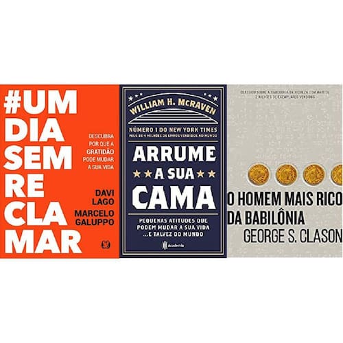 Kit 3 livros um dia sem reclamar + Arrume a sua cama + O homem mais rico da Babilônia Umdiasemreclamar: Descubra por que a gratidão pode mudar a sua vida Capa comum - Edição padrão, 15 janeiro 2021Por Davi Lago Autor , Marcelo Galuppo Autor Editora : Citadel; 1 edição 15 janeiro 2021 Idioma : PortuguêsCapa comum : 160 páginasISBN-10 : 6587885047ISBN-13 : 978-6587885049Dimensões : 15.6 x 0.94 x 23.39 cmCondição do Item: NovoTipo de Narração: Manual Quantas vezes você reclamou de algo hoje Já parou pra pensar como é difícil ser grato e como focamos muito mais a nossa atenção nos problemas e não nas soluções Este livro lhe propõe o seguinte desafio: passe um dia 24 horas sem reclamar. Para realizá-lo, você precisará registrar o horário em que iniciará o exercício. E não será preciso registrar quantas vezes você viola seu comando porque, a cada vez que você o fizer, deverá reiniciar a contagem do tempo. Segundo os autores, a principal função deste exercício é tornar-nos conscientes de que a ingratidão é o padrão natural do ser humano. Além dele, você encontrará aqui mais seis exercícios de gratidão e mudará para sempre a maneira como encara os seus problemas. Arrume a sua cama: Pequenas coisas que podem mudar a sua vida... E talvez o mundo - 2 Edição Capa comum - Edição padrão, 22 março 2019Edição Português William H. Mcraven Autor , Eliana Rocha Tradutor Editora : Academia; 2 edição 22 março 2019 Idioma : PortuguêsCapa comum : 128 páginasISBN-10 : 8542215788ISBN-13 : 978-8542215786Dimensões : 20.8 x 13.6 x 1.2 cmCondição do Item: NovoTipo de Narração: Manual Quando foi convidado para proferir a aula inaugural dos alunos de graduação da Universidade do Texas, o almirante William McRaven pensou em compartilhar suas lições sobre liderança. Afinal, em 37 anos de carreira na marinha norteamericana, ele exerceu o comando em vários níveis - inclusive tendo sido o responsável pela missão que capturou Osama bin Laden. O que ele não imaginava é que o discurso fosse parar nas redes sociais, viralizar e ter mais de 10 milhões de visualizações Impressionado com o impacto e com o apelo universal, McRaven transformou a palestra em livro no qual resume as 10 lições que aprendeu no treinamento das forças especiais. Assim como o vídeo, o livro virou um best-seller: ficou meses em primeiro lugar na lista do jornal The New York Times. O homem mais rico da Babilônia Capa comum - Edição padrão, 4 agosto 2017Edição Português por George S Clason Autor Editora : HarperCollins; 1 edição 4 agosto 2017 Idioma : PortuguêsCapa comum : 160 páginasISBN-10 : 8595081530ISBN-13 : 978-8595081536Dimensões : 20.6 x 13.4 x 0.6 cmCondição do Item: NovoTipo de Narração: Manual Com mais de dois milhões de exemplares vendidos no mundo todo, O homem mais rico da Babilônia é um clássico sobre como multiplicar riqueza e solucionar problemas financeiros. Baseando-se nos segredos de sucesso dos antigos babilônicos - os habitantes da cidade mais rica e próspera de seu tempo -, George S. Clason mostra soluções ao mesmo tempo sábias e muito atuais para evitar a falta de dinheiro, como não desperdiçar recursos durante tempos de opulência, buscar conhecimento e informação em vez de apenas lucro, assegurar uma renda para o futuro, manter a pontualidade no pagamento de dívidas e, sobretudo, cultivar as próprias aptidões, tornando-se cada vez mais habilidoso e consciente.