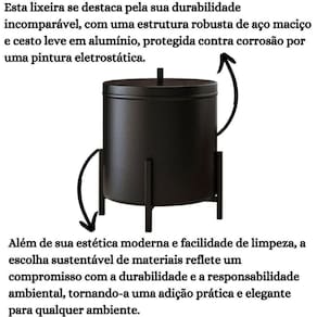 Cesto em Alumínio: O cesto em alumínio encaixa perfeitamente na base, evitando o contato direto com o chão, mantendo a higiene e facilitando a limpeza.