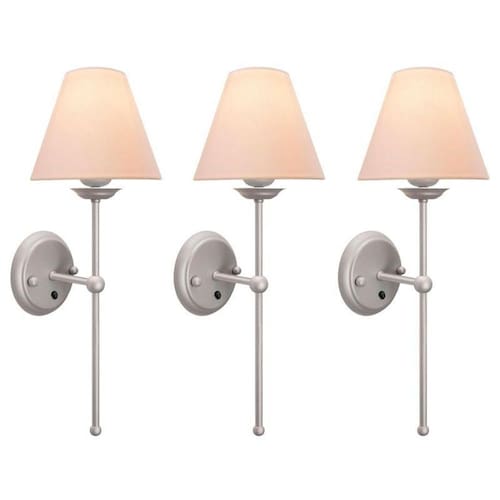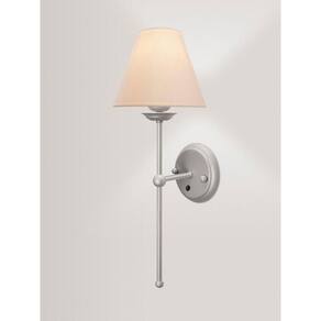 Modelo : sl-130 Cor es : prata Material : alumínio Cúpula de tecido : 17cm x 16,5cm Base canopla : 12cm Soquete da luminária : e27 Número de lâmpadas : 1 lâmpada Voltagem : 127v / 220v Medida : 50cm x 19cm x 16,5cm Conteúdo da embalagem : 3 arandela