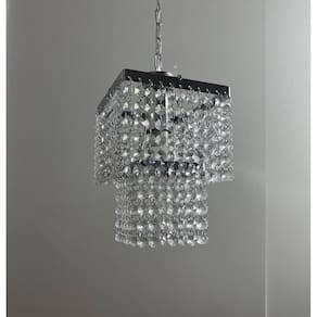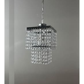 Base Quadrada em metal Cromado, 2 Camadas. Altura 27 cm + 25 cm corrente = 52 cm pode instalar diretmanete no teto Castanha: 804 de 14mm em cristal acrilico alto brilho Lampada: 1 x E27 Bivolt Peso Aprox. 1.0 Kg