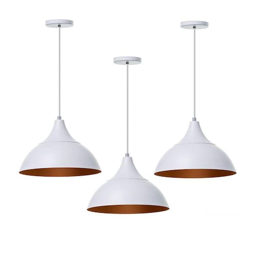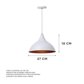 Kit 3 Lustre Pendente Panamá Branco Com Cobre Alumínio - dimensões: 18x27cm - canopla redonda de 11cm de diâmetro - produto feito em alumínio - 150cm de fio ajustável - pronto para instalação - utilize a lâmpada que desejar - soquete e-27 - garantia de 6 meses contra defeitos de fabricação - lâmpadas não inclusas neste produto.
