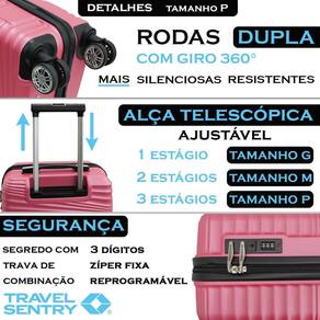especificações técnicas - material externo: abs - material interno: forro 100% em poliéster forro pode variar a cor bege ou preto - rodinhas duplas giratórias 360 - carrinho em alumínio com duas alturas diferentes no tamanho m e p - divisória interna com bolso em tela e fechamento por zíper - cadeado com padrão internacional tsa com segredo, nos tamanhos m e g
