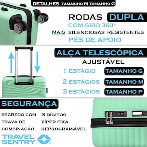 Além disso, possui quatro rodas multidirecionais com giro 360º, puxador ergonômico com botão liberador de ajuste/posição, cadeado numérico tsa acoplado, garantindo assim, mais segurança para bagagem, alça lateral e pés de apoio.