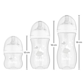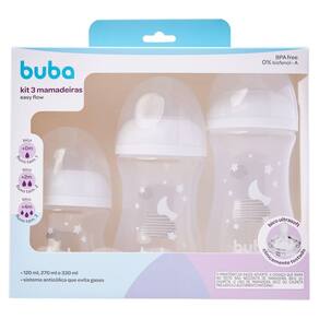 O kit inclui 3 mamadeiras com capacidade de 120ml, 270ml e 330ml e bicos fluxo tamanhos 1,2 e 3.