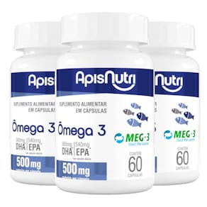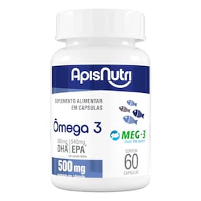 Kit 3 ômega 3 epa dha apisnutri 60 cápsulas Sobre o produto É um suplemento à base de óleo de peixe, contendo epa e dha, considerado uma 'gordura boa' e essencial, pois não pode ser produzido naturalmente pelo organismo, devendo, portanto, ser obtido através da alimentação e/ou suplementação. O selo meg-3 garante a qualidade das matérias-primas utilizadas na fabricação do suplemento. O óleo de peixe com esta certificação é altamente purificado e também é rico em epa e dha, os principais tipos de ácidos graxos ômega 3. Modo de usar Ingerir 06 seis cápsulas ao dia. Recomendação de uso: 19 dezenove anos ou acima. Ingredientes Ingredientes: óleo de peixe e antioxidante: acetato de dl-alfa-tocofero. Cápsula: gelatina. Alérgicos: contém derivados de peixe. Não contém glúten. este produto não é um . não exceder a recomendação diária de consumo indicada na embalagem. mantenha fora do alcance de crianças. este produto não deve ser consumido por gestantes, lactantes e crianças. Manter a embalagem bem fechada em local seco e fresco. Não expor à luz solar. Consumir em até 30 dias após aberto. Produto dispensado de registro conforme rdc 240/2018. Apresentação Classificação: suplemento alimentar de óleo de peixe em cápsulas quantidade de cápsulas: 60 cápsulas de 500 mg peso líquido: 30g Marca: Não Informado