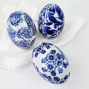 Composição: 3 ovos decorativos de porcelana Material: Porcelana de alta qualidade Cores: Azul e branco com detalhes florais delicados Peso: 140g cada Design clássico e sofisticado, ideal para a Páscoa