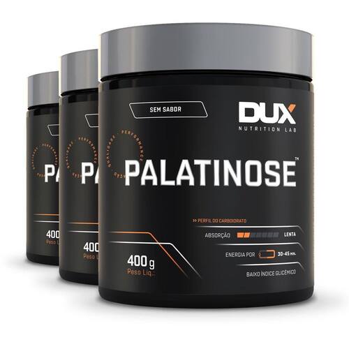 Kit 3 Palatinose Dux Sem Sabor 400g Ingredientes: isomaltulose. Modo de consumo: consumir uma porção uma vez ao dia. Modo de conservação: conservar ao abrigo de luz, calor e umidade. Após aberto, consumir em até 180 dias. Manter a embalagem fechada após o uso. Alérgicos: pode conter trigo, aveia, amendoim, soja, leite, amêndoa, avelãs, castanha-de-caju e pistaches. Contém glúten. Marca: Não Informado