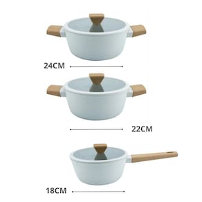 1 Caçarola 24cm, 1 Caçarola 22cm, 1 Panela 18cm.