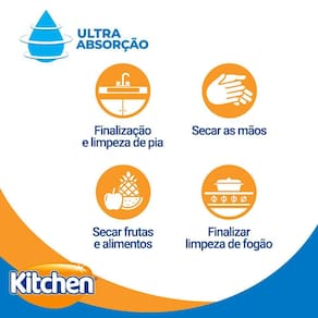 As toalhas de papel Kitchen são a perfeita escolha de quem deseja máxima absorção, resistência e praticidade para o dia a dia. Kitchen serve para tudo nas mais variadas ocasiões, desde a absorção em alimentos até a secagem de louças e superfícies, o embrulho de lanches e frutas e auxílio na limpeza leve. Disponível nas versões folha dupla com 120 folhas, 240 e 540 folhas.