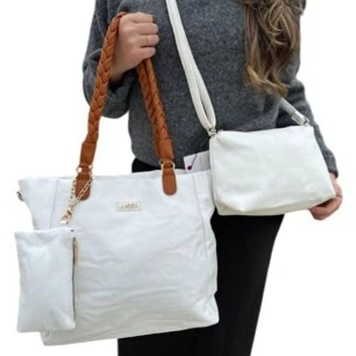Kit 3 Peças Bolsa Feminina Branca Grande Média + Necessarie ===================================== Com alças trançadas caramelo design moderno e acabamento sofisticado, ela é ideal para o dia a dia, viagens ou compromissos especiais. O kit é composto por uma bolsa grande com alças trançadas e zíper frontal, perfeita para carregar tudo com estilo e organização; uma bolsa média transversal com alça ajustável, ideal para passeios e uso diário; e uma necessaire com zíper, ideal para maquiagem, documentos ou pequenos itens. A bolsa grande pode ser Utilizado no ombro, enquanto a transversal oferece praticidade no uso cruzado, e o acabamento em dourado complementa o visual refinado do conjunto. Funcional, estiloso e versátil, ideal para quem busca beleza e organização no dia a dia ou deseja presentear com bom gosto ===================================== Contém: 01 Bolsa Grande 01 Bolsa Média 01 Necessaire Especificações: - Material: material sintético - Medida Bolsa Grande: 11cm x 30cm x 27cm - Medida Bolsa Média: 28cm x 18cm - Medida Necessaire: 17cm x 10cm - Peso: 1100 gramas - Cor: Branco ===================================== Devido à diferença entre monitores e iluminação diferentes, pode haver variação na tonalidade apresentada no anúncio. Medidas muito aproximadas.