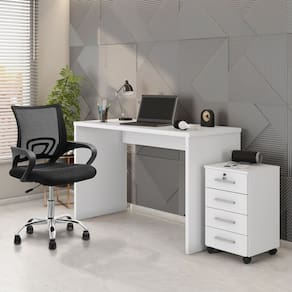 A cadeira tem estrutura em poliuretano de altíssima qualidade, que proporciona muito mais resistência, mesmo com o passar dos anos. O acabamento em verniz deixa o móvel mais bonito e dá mais destaque a decoração de toda a casa. Essa cadeira tem design versátil, assento confortável e vem com kit de montagem, para tudo ficar mais rápido e prático. Ela suporta até 120 kg de peso máximo, que dá mais tranquilidade ao sentar e tem 4 pés com rodízios em PU que não arranham o piso do cômodo. Acabamento: Pintura UV Altura do Conjunto: 85 cm Ambiente: Escritório Ambiente Principal: Escritório Cor: Branco/Preto Informação Complementar: 1x Escrivaninha Gávea Office 127cm Branco White Largura: 127 Largura: 127 cm Altura: 75 Altura: 75 cm Peso: 25 kg Profundidade: 53 cm Profundidade: 53 cm Necessita Montagem: Sim Necessita Montagem: Sim